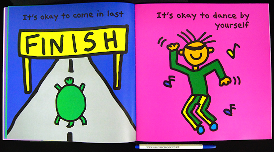 In It's Okay to Be Different, Todd Parr shows that it is all right to accept differences in ourselves and others. Parr uses loud, colorful illustrations to keep the attention of the reader and the repetition of the phrase "It's okay" to make a substantial point about various differences, including physical differences, ideas, and concepts. Parr utilizes vibrant colors and simple drawings to keep the reader's attention. Almost every page has it's own "It's okay" statement. Since the backdrop of each statement is a different color than the previous one, each "It's okay" statement becomes the focal point. Parr completes the "It's okay" statements with a lesson in feeling special and important while using the contrast of differences. The book unites the concept of tolerance of differences with simple images for easy understanding and comprehension. It's Okay to be Different encourages readers to accept themselves and others.