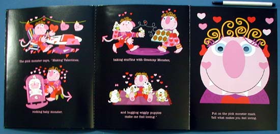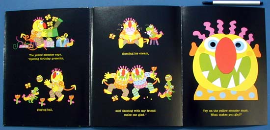 Children who lack the vocabulary to distinguish the emotions they're feeling may find some comfort in this book, which makes use of masks to unmask feelings. Each spread shows little brightly colored monsters acting out different emotions--pink monsters cut out valentines and bake cookies to express love, yellow monsters play ball and open birthday presents in the name of happiness--while a gatefold page reveals a big mask of whatever emotion is covered in that spread. The eyes and noses are punched out, so children can hold those pages up and ``wear'' the mask. It's a good idea, but easier in theory; the book is heavy for the young children at whom the book is aimed, and older ones will find it hard to put on the mask, read the book, and keep the pages intact; institutions should expect rips and stock multiple copies. The book has a use, whether teaching the names of emotions, or helping children express them.