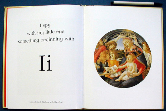 The perfect art book for small children is one that opens their eyes and makes them want to keep looking. I Spy, surely the most cultured alphabet book around, is just right. Parents can leave it out on a table and let it work its magic silently. Its cover picture--René Magritte's Son of Man, a painting of a man in a Homburg and overcoat who inexplicably has a green apple where his face ought to be--has just the right touch of whimsy to grab a toddler's attention, but older children (up to about age 80) should love it, too. Inside, there are 26 paintings: large, clear, colorful, and one to a page. Across from each plate is an alphabet letter, shown both capitalized and lowercase, and the words, "I spy with my little eye something beginning with..." The Magritte starts off the alphabet (A is for apple, of course), and then Henri Rousseau's Football Players keeps the ball rolling, so to speak. Lucy Micklethwait includes wonderful selections of pictures children can dream about, including an Indian painting, Workmen Building the Palace of Fatehpur Sikri (E for elephant), Goya's incomparable Don Manuel Osorio Manrique de Zuniga (M for magpie), and Miró's Woman and Bird in the Moonlight (S for star). Click to see the spread with Marc Chagall's The Bride and Groom of the Eiffel Tower (V for violin). Compilation and text © 1992 by Lucy Micklethwait. Permission by Greenwillow Books. (Preschool and older) --Peggy Moorman |