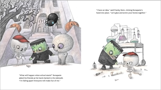 Luckily, Bonaparte hit the bone-anza when it came to his friends. Franky Stein, Black Widow, and Mummicula all have some boneheaded ideas to help pull him together. But will it be enough to boost his confidence and get him ready for the first day of school?