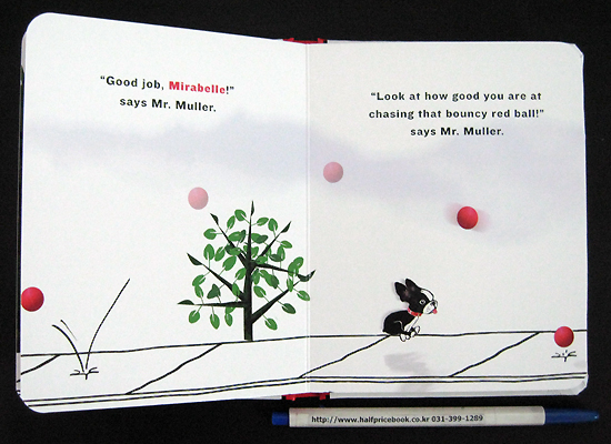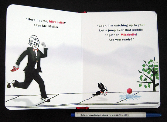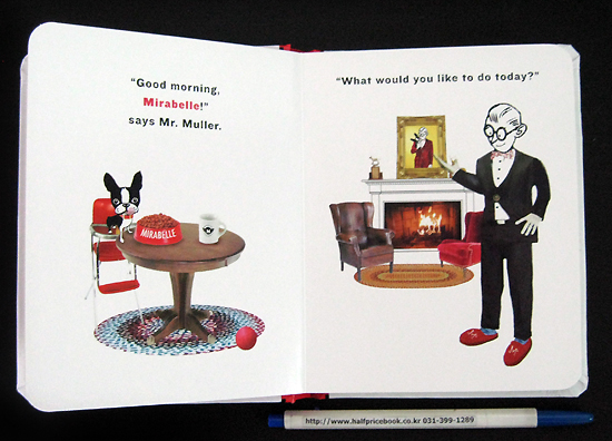 With her oversized head, black-and-white features, and round, wide-set eyes, Mirabelle is the most expressive of dogs. She looks inquisitive, feisty, happy, smart, and eager. Eager for what? For adventure! Together with her owner, Mr. Muller, in his bow tie and big eyeglasses, Mirabelle fills her days with activities like playing catch with a red rubber ball or going for a late-afternoon walk and stopping at an ice cream truck. Mirabelle and Mr. Muller know what every little kid knows— the simplest thing can be endlessly fascinating and fun.