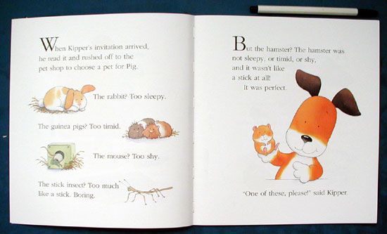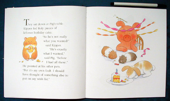 Pig is having a birthday party and the only thing on his wish list is a pet, so Kipper rushes to the pet store and buys his friend a hamster. At home, the pup has great fun feeding and playing with it. He names it and begins to think he would like to keep the little guy. He gets caught up in building Roly a wild hamster ride and misses the party. When he gets to Pig's house, it turns out that the birthday boy has already gotten three new pets as presents and asks Kipper if he will take care of Roly for him. Watercolor cartoons complement this light and amusing story. The funniest illustrations are a series of nine small pictures that depict the steps of Roly's wild ride through all of Kipper's gadgets. Children should enjoy this simple tale.
