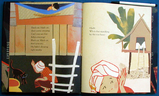 This is a bedtime story featuring the creatures and sounds of the Thailand countryside. It is a lilting tale of a tired mother trying to quiet the animals so baby will sleep. After she finally succeeds in silencing the sounds of the evening, the exhausted mother falls asleep. Who is the only one wide-awake? Any parent knows the answer. Baby is awake, looking wide eyed at the world around him.