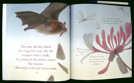 Bat Loves the Night by Nicola Davies, illus. by Sarah Fox-Davies, follows the pipstrelle bats' nocturnal wanderings. Dusky watercolor-and-pencil illustrations add enigmatic beauty; bat facts appear in a different typeface and illuminate the narrative. Pencil sketches on the endpapers label different kinds of bats with their common and scientific names.