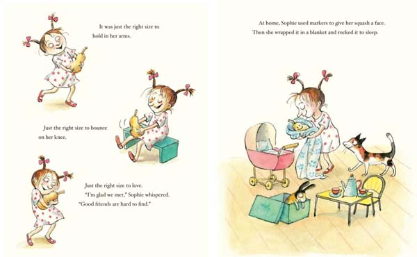 Who says children don¡¯t love vegetables? Sophie certainly does, as her best friend is a yellow squash she has named Bernice. Even though Bernice is supposed to be dinner, Sophie draws a smiling face on her and convinces two very tolerant parents to let her keep the gourd as a playmate. The two have tea parties, somersault down the hill, go to library storytime, and have sleepovers. As the summer wanes, Mom is always exploring new recipes for cooking Bernice before she rots away altogether. ¡°Don¡¯t listen, Bernice!¡± Sophie cries in terror, shielding her friend. In the fall a blotchy Bernice seems softer and ¡°her somersaults lacked their usual style,¡± so Sophie plants her in the garden. In a perfect blend of story and art, the humorous watercolor-and-ink illustrations are bursting with color and energy on every page, replete with patterns in swirls, stripes, florals, and polka dots appearing on clothing, curtains, and upholstery. Endpapers depict the pigtailed Sophie with her jaunty red bows in constant motion-running, tossing, flipping, cuddling, and balancing the squash. This is a paean to love and friendship, which can come in all species, shapes, and sizes.