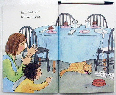 Once there was a kitten, much loved by his family. But the kitten grows up to be a "bad, bad cat". He scratches the table and claws the chair. He rips pillows and messes up the bed. Bad Cat eats plants and yanks up flowers, spills milk and swipes cupcakes. He lives up to his name! After each escapade, his family scolds him. Tired of being reprimanded, Bad Cat runs away. His family looks for him everywhere. They leave the window open with a plate of his favorite treats to tempt him back. They miss him terribly. Then Bad Cat comes home, forgiving them. His family is so glad to see him, they don't care if he is still acting naughty. With its large type, short text, and simple vocabulary, this title is a winner for newly independent readers. True Kelley's "cartoon-y" illustrations provide visual clues and delight the reader with her drawings of the sly-eyed, cupcake-stealing lead character. 2002, Grosset and Dunlap, - Candice Ransom |