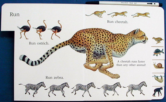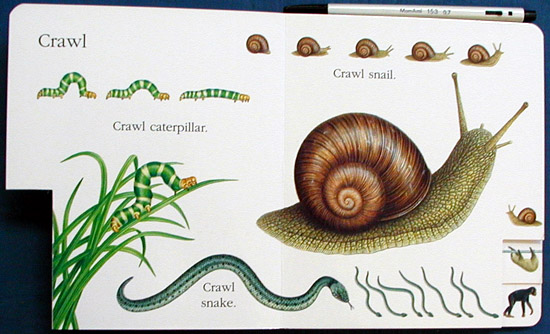 This delightful board book is sure to please all young nature lovers. Part of the publisher's "First Discovery/Look It Up Board Book" series, there are seven sections, each one featuring animals and the type of motion they are most associated with푙rogs and jumping, fish and swimming, snails and crawling and people and walking. Four of the seven sections also impart useful information, such as that fish breathe through gills and baby kangaroos travel in their mother's pouches. |
