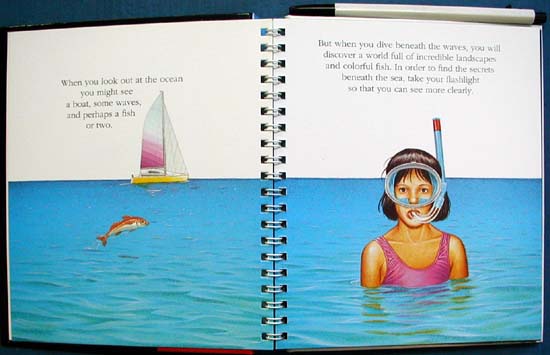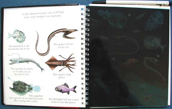 Introduces some of the animals that live under the sea, such as jellyfish, sea anemone, swordfish, and gulper eels. Includes a special flashlight for illuminating the illustrations.
