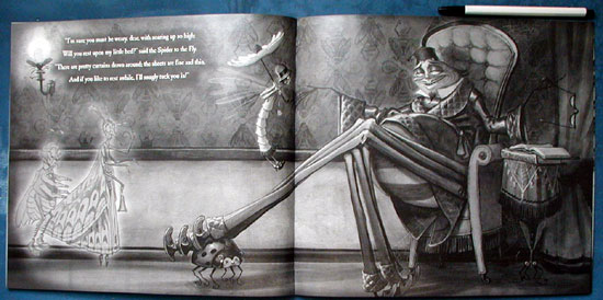 "'Will you walk into my parlor?'/said the Spider to the Fly." Howitt's 1829 cautionary poem is realized here in full cinematic fashion. Delightfully ghoulish full-bleed black-and-white spreads are rendered in gouache and pencil, and reproduced in silver-and-black duotone, resulting in images that recall the slightly fuzzy-edged figures from old black-and-white horror movies. The typeface and occasional framed text pages heighten this effect by evoking silent-movie titles. The setting is a dustily gothic attic in which DiTerlizzi's (Alien and Possum: Friends No Matter What, ) "camera" never rests, zooming in, out, up, and down in a dazzling series of perspectives as a top-hatted and bespatted spider romances a na?e flapper fly. Her protestations in the face of his overtures grow ever weaker, and despite the warnings of the ghostly figures of past victims (one brandishes a knife and fork while another points urgently at The Joy of Cooking Bugs), she goes to her inevitable doom. The illustrations embrace the primness of the poem -- the wide-eyed fly is the very picture of a bygone innocence -- but introduce a wealth of detail that adds a thick layer of humor. Aside from the aforementioned ghosts, evidence of the spider's predilections abounds: in his parlor, he relaxes with his feet up on a very dead ladybug stool with X's for eyes. A tongue-in-cheek "letter" from the spider follows the poem, in which he exhorts readers to "be advised that spiders are not the only hunters and bugs are not the only victims." This cautionary intrusion serves to explicate the metaphor for concretely minded readers, but the message is not likely to diminish their pleasure in the grisly doings one bit.