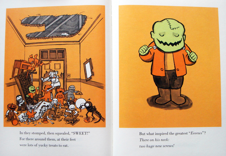 The illustrations have traded sunny yellow for pumpkin orange backgrounds and make comically sly allusions to the original title.