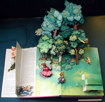 Moreover, Sabuda's faithful adaptation of the original Carroll text is a pleasure to read. It appears on separate page flaps that are pasted on the side of each of the six spreads, adjacent to an exploding main tableau that rather than simply unfolding, literally flies off the page (watch out for your eyes).
