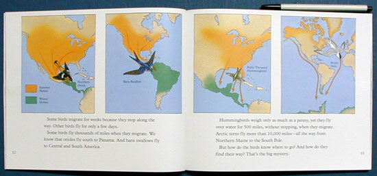 Gans limits her discussion to basic facts about birds and their instinctive travel habits. She tells what ornithologists know about migration patterns and presents some of their theories about how birds know when to fly and their different means of navigation. Watercolor and colored-pencil illustrations show several species and their habitats, as well as a few maps and charts. The careful coloring and identification of specific birds add to the value of this attractive introductory text, but its lack of an index limits its use for reports.Kathy East, Wood County District Public Library, OH |