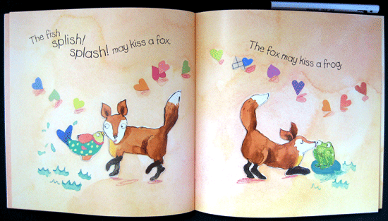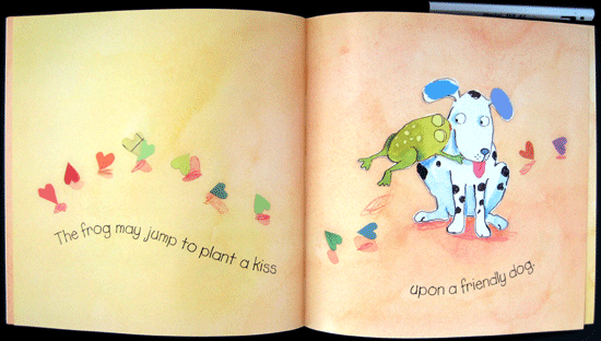 This tale charts the travels of love unleashed: "Blow a kiss and let it go/ You never know/ how love will grow!" Watercolor and cut-paper collage hearts wend their way through the pages, sending the smooch from cat to cow and back to "you-know-who."