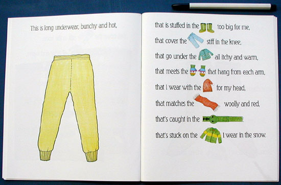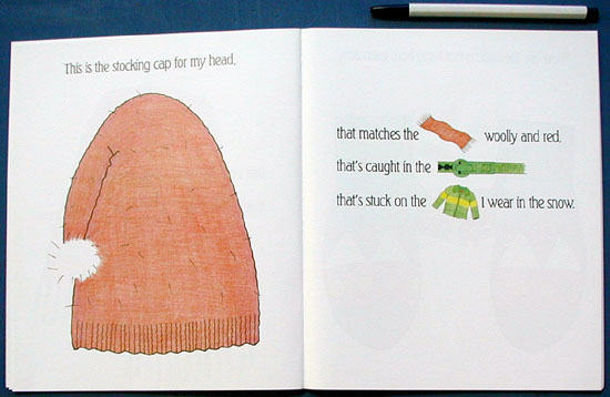 Rhyme follows rhyme as layer after layer of winter clothing ("bunchy and hot, wrinkled a lot, stiff in the knee, and too big for me!") is first put on and then taken off to the relief of the child bundled inside. Clever rebuses and jaunty illustrations make The Jacket I Wear in the Snow especially fun for prereaders and new readers.