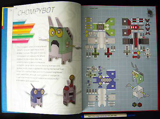 Colors, designs, and size can be manipulated using any standard editing package so you can create over 250 variants for a full robot army. The models print out on letter-sized paper and are assembled using rubber bands or fishing line, it's that easy! There are even templates for a cityscape suitable for crushing or a Super Dimension- type fortress for a robot takeover.