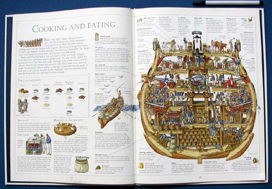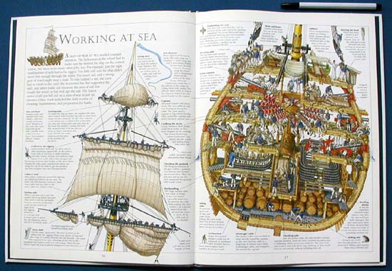 The creators of Stephen Biesty's Incredible Cross-Sections have trained their writing and illustrative talents on an eighteenth-century British man-of-war. Moving from bow to stern, they dissect the wooden vessel into sections and then cut away each portion to analyze the structures and the activities performed within. In addition, each chapter discusses a different aspect of life at sea, from working to leisure time to cooking and eating to navigation and discipline. Readers studying the large cutaway diagrams will be fascinated by the detailed hustle-bustle typical of a ship carrying a crew of 800 sailors. But life was brutal on board, and Biesty doesn't flinch from some of its goriest aspects--a bucket of bloody amputated limbs beneath the surgeon's operating table, dismembered bodies plummeting into the sea during battle, and maggots in the sailors' biscuit rations. The intriguing text, presented in brief, anecdotal notes, is accompanied by smaller drawings, making this meticulously presented book a treasure of factual content and visual imagery. Ellen Mandel