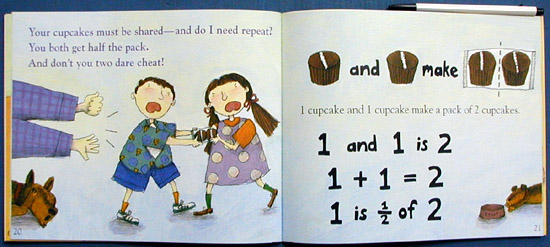 The concept that "1/2 + 1/2 = 1" is presented using two bickering siblings who cannot share anything without parental intervention. Finally, the situation degenerates into a food fight, and the kids decide that if they each clean up half, they'll be done a lot sooner. Although the presentation of the math concept is clear and straightforward and the acrylic, gouache, and pencil illustrations are colorful and quirky, the singsong rhyme and lack of any real plot make this a less interesting choice than Pat Hutchins's The Doorbell Rang (Greenwillow, 1986). A list of suggestions for adults using the book with children follows the story.JoAnn Rees, Sunnyvale Public Library, CA |