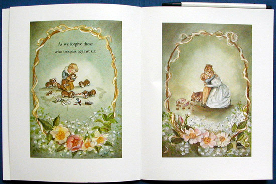 "The stately text of the Lord's Prayer...is exquisitely illustrated by the soft, rich glow of Tudor's customary delicate and sentimental watercolors. The backgrounds show rural New England of the Victorian era, filled with charming children, appealing little forest creatures, mischievous Corgi dogs and striped cats."