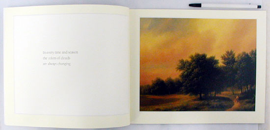 This beautifully designed book celebrates clouds as they appear during the different hours of the day and seasons of the year. Each two-page spread features a few lines of prose on the verso and an illustration encompassing most of the recto. The oil paintings are done in subdued and relaxing colors. Many of them show a small child walking with an adult on a path. The book does not have a lot of action, but would be perfect for quiet and relaxed sharing between adult and child. Factual information about clouds is provided on the last two pages.