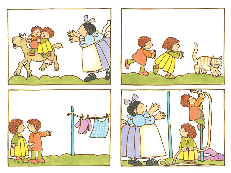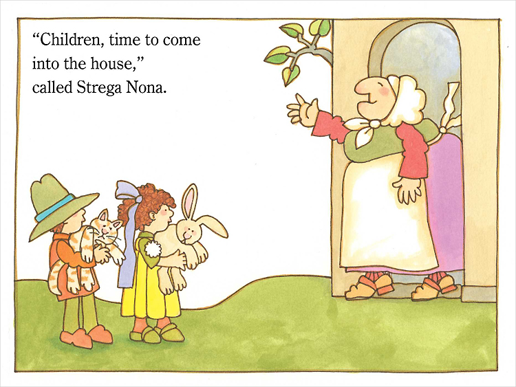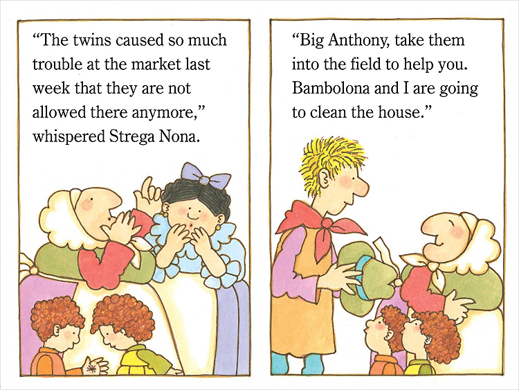 Strega Nona is babysitting twins for the day. Bambolona and Big Anthony help too. The twins, on the other hand, do not help with anything! They get into trouble everywhere they go! Luckily, Strega Nona knows what to do.