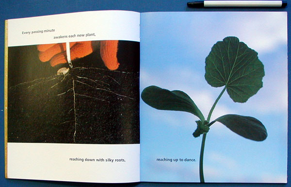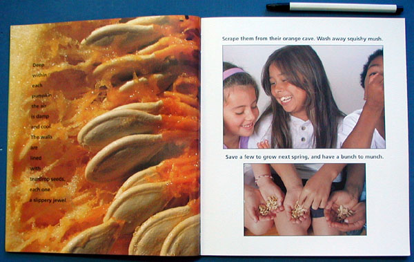 Rhyming text and glowing photographs follow a pumpkin patch as it grows and changes, from seeds to plants to pumpkins ready to harvest to jack-o-lanterns and then to seeds again. Full color.