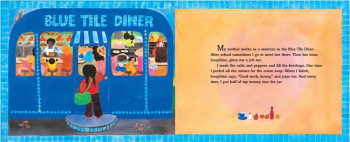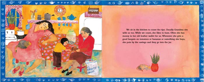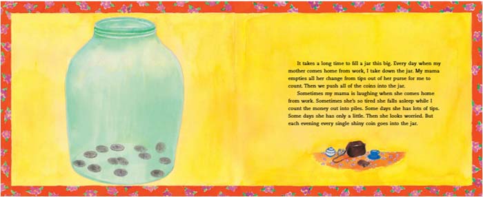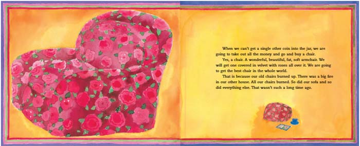 A young girl tells how she, her mother, and her grandmother save up all of their spare coins in a big glass jar toward the day when they will buy a much-needed easy chair. (Their old furniture and their possessions were destroyed in a fire.) If the plot is scant-after the jar fills up, mother, daughter, and grandmother buy the chair and bring it home-the atmosphere of anticipation and family warmth is strong. Williams' illustrations are energetic watercolor paintings brimming with color and a cozy, indulgent expressionism. Intense roses, blues, yellows, and greens vie for attention in the pictures' blocky compositions, where natty patterning adds extra spice. A striking, offbeat backdrop for a loving story.