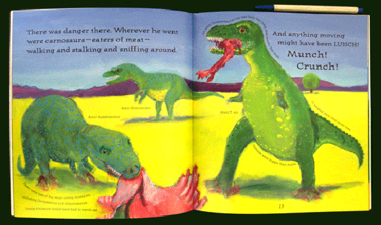 Lots of types of creatures start from an egg including our own human form. When a grandfather and his grandson visit a dinosaur museum there are many questions, answers and further speculation about how dinosaurs lived on our earth. The beginning of the book tells the reader that the larger print is the grandfather's voice and the smaller print is the grandson's voice. The middle size printing is from the scientist's viewpoint. Many facts that are attributed to T. Rex are given to the reader, but at the same time many questions still are unanswered. Poor grandfather seems to repeat the statement that he doesn't know for sure, as it all happened millions of years ago. The ending is charming as the grandfather explains that perhaps the person who finally finds all the correct facts about T. Rex might just be you. This is a colorful book with good dinosaur information.