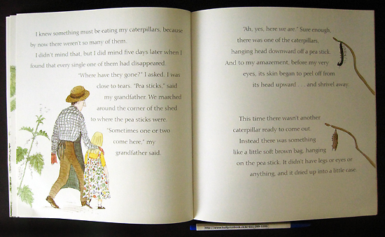 The familiar story of a child's awakening to the miracles of nature is convincingly told here. A little girl wonders why her grandfather doesn't uproot the stinging nettles in his garden. After he explains the weeds' importance to certain types of butterflies, he locates some of their eggs on the leaves and encourages her to watch what happens. The child patiently observes each stage of the insects' development, learning in the meantime about the characteristics and habits of various species. Finally, to her delight, she witnesses the emergence of a peacock butterfly from its chrysalis. The text clearly describes the insects' life cycle and competently conveys the warm relationship between the girl and her grandfather. Voake's pen-and-watercolor illustrations, however, are disappointingly drab. The nettles, dominant throughout, are rendered in pale olive green; the caterpillars, most of which are depicted from a distance, look more like prickly twigs than insects; and the characters, drawn with minimal facial features, are flat and unappealing. Additional information is provided in extended captions underneath the drawings, but the print is arranged in a series of curving lines and is hard to read. Joanne Ryder's Where Butterflies Grow (Lodestar, 1989) is a better choice for young readers; its text does an excellent job of describing the metamorphosis of a swallowtail butterfly, and the closeup, vibrant drawings of each developmental stage are outstanding.