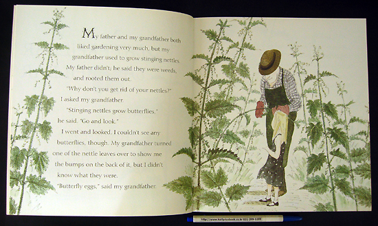 Kindergarten-Grade 3-The familiar story of a child's awakening to the miracles of nature is convincingly told here. A little girl wonders why her grandfather doesn't uproot the stinging nettles in his garden. After he explains the weeds' importance to certain types of butterflies, he locates some of their eggs on the leaves and encourages her to watch what happens. The child patiently observes each stage of the insects' development, learning in the meantime about the characteristics and habits of various species. Finally, to her delight, she witnesses the emergence of a peacock butterfly from its chrysalis. The text clearly describes the insects' life cycle and competently conveys the warm relationship between the girl and her grandfather. Voake's pen-and-watercolor illustrations, however, are disappointingly drab. The nettles, dominant throughout, are rendered in pale olive green; the caterpillars, most of which are depicted from a distance, look more like prickly twigs than insects; and the characters, drawn with minimal facial features, are flat and unappealing. Additional information is provided in extended captions underneath the drawings, but the print is arranged in a series of curving lines and is hard to read. Joanne Ryder's Where Butterflies Grow (Lodestar, 1989) is a better choice for young readers; its text does an excellent job of describing the metamorphosis of a swallowtail butterfly, and the closeup, vibrant drawings of each developmental stage are outstanding.