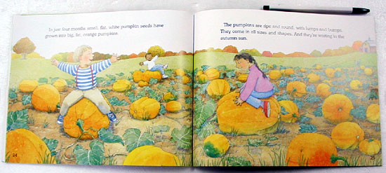 Another entry in the popular and useful science series, this title explains in simple, clear language the stages in the development of a seed into a pumpkin. A couple of easy recipes and experiments are appended. Appealing watercolor-and-pencil illustrations show children involved in planting and tending the pumpkins, and help make the process and the passage of time understandable to this audience.