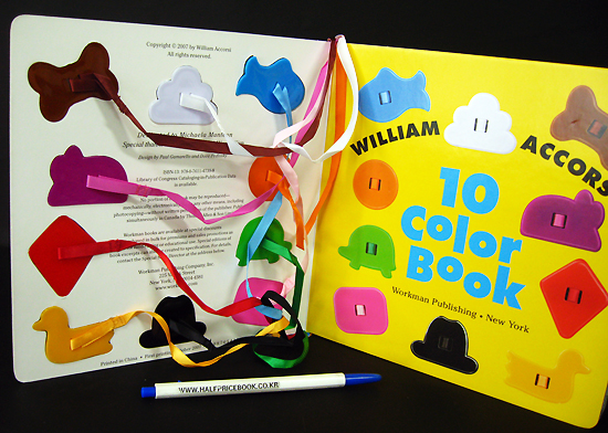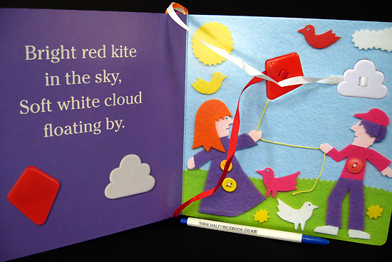 10 Color Book features ten brightly colored, government-safety-tested plastic shapes attached to durable ribbons bound into the book's spine. The object? Match each button to a corresponding die-cut space in the pages. Little yellow duckie swim to me: pick up the yellow duck shape and snap it into place. Find a yummy brown bone for a dog named Ace, the bright red kite in the sky, a soft white cloud floating by. Little kids will want to pop the shapes in and out, over and over again. Plus, the book's double-thick board pages are a pleasure to turn, and its vibrant cut-felt art and lively rhyming text are guaranteed to engage young imaginations.