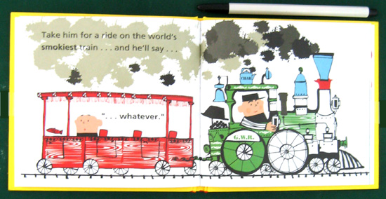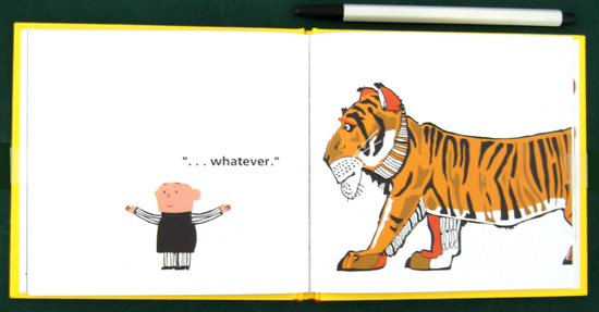 This English author/illustrator has created a book that puts one in mind of the works of William Steig and Maurice Sendak. Billy, the main character, is a boy who is "very difficult to please." His father tries extremely hard to impress his son with all sorts of things. These range from a very tall giraffe to a ride on a seriously smoky train to a trip in outer space. But to each, the sullen boy merely replies, "Whatever." Finally, Billy's dad introduces him to a really hungry tiger who, upon hearing his bored "Whatever," promptly swallows Billy in one big gulp. Now the boy appeals to his dad for help but, you guessed it, he gets only a terse reply..."Whatever." The highly stylized, cartoonish illustrations are boldly drawn with heavy black lines and vivid color. They are a good match for the story. This is certainly not a book to be given to every child, but is sure to appeal to those who enjoy Where the Wild Things Are.