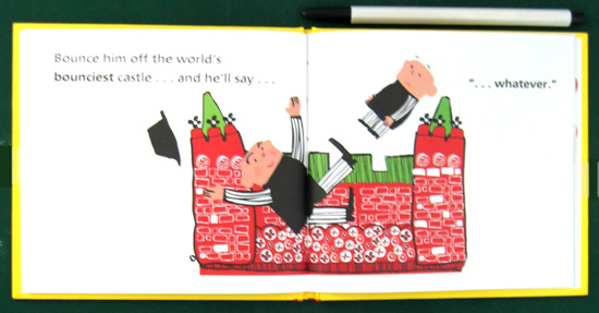 "Billy can be very difficult to please." His dad tries hard for any reaction at all, but Billy's reply is just " . . . whatever." The spare text on the double pages leaves room for depicting the "something very tall . . . " or "very small," for the world's curliest trumpet," or for bouncing Billy off "the world's bounciest castle or riding the world's smokiest train. Billy's response is always the same " . . . whatever." Finally, his dad tries to frighten him with "the world's hungriest tiger . . . " The result is rather a shock. But it does finally bring a different reply from Billy. And a rather amusing " . . . whatever" from his dad. Digitally created simplified figures on white pages with no context, not even a ground line, match the minimal text. But the visuals deliver the humor in the facial expressions and props. That "curliest trumpet" is a wonderfully intricate piece of yellow and tan plumbing with valves, meters, and a sinuous intertwining that fills the spread. The tall giraffe incorporates yardsticks in its long neck as it requires turning the book on its side for the vertical double page. Other detailed bits add to the visual fun.
