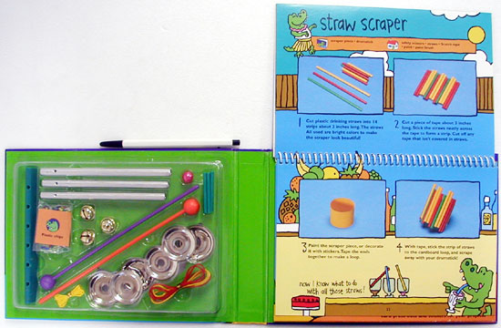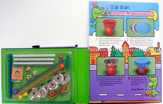 Ali the Alligator provides step-by-step instructions for children to make a wide variety of musical instruments in this book/kit. For each instrument, the author provides clear, simple instructions as well as pictures showing how the instrument looks at each stage in the process of creation upon completion. Many of the materials needed are included in packages built into the book, and the rest can easily be found around the house or classroom. Children will be delighted with their homemade rattle drums, chime bells, tambourines, castanets, and more. The instruments introduce children to different sounds. They also encourage children to think creatively about various household items that may produce musical sounds. These projects are a great introduction to music and instruments and are especially useful for rainy days. |