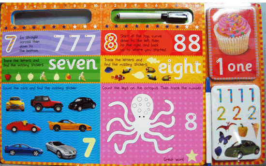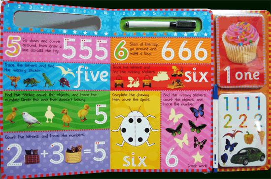 Wipe-clean pen with eraser encourage practice on wipe-clean board pages. Re-usable stickers and 26 wipe clean flashcards encourage participation and writing of letters and numbers. |
