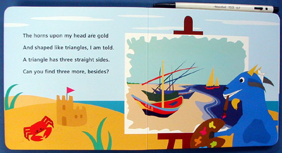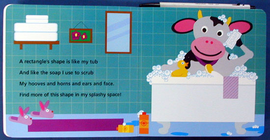 "Julie Aigner-Clark is a genius! Her inventive products, exceptionally creative, are designed to entertain children while they learn. See and Spy Shapes, is no exception. The cleverly written text is metrical in style, and teaches shapes and counting in an imaginative way - through seeing and spying the object by means of example. For instance, the reader sees a rabbit sitting in a garden with various items scattered about, and the poem on the left side of the book reads, "CIRCLE is a crazy thing it has no sides, just one round ring. You'll see a CIRCLE on my nose, now find five more beneath my toes." The FIVE circles beneath the rabbit's toes are: a radish, a head of lettuce, an onion, a bug, and a watermelon. Each page of this little board book features a different poem, animal, and shape. Additional shapes include: triangle, square, oval, rectangle, star, and diamond. The illustrations are brightly colored, and are highly contrasted to the background, creating emphasis to stimulate babies interest, while providing lessons on shapes, numbers and counting, colors, animals and other everyday objects for preschoolers. This is an outstanding book! Birth and up." |