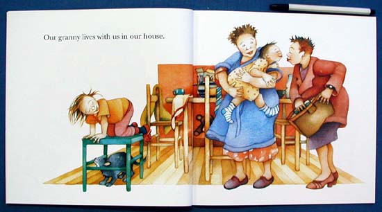 Two children compare their granny with others. Some grannies have thin legs, fat knees, crinkly eyes, or big soft laps. Their granny has a wobbly bottom and wears an old red sweater that was grandpa's. She has a style all her own--and to the children who love her, this granny is perfect. Full of warmth and good humor. Full color.