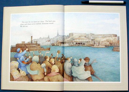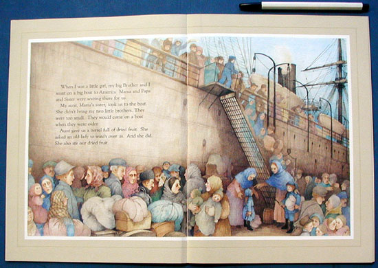 Many years ago two small immigrants made the boat journey alone from the Old World to Hester Street. Theirs is the special story that the young narrator's great-grandmother used to tell. The story is a common, satisfying one of a brother and sister's reunion with their parents. Nothing extraordinary happens, but of course, the family's life is changed forever. There is no dialogue in the story, and only the details important to a child are included, so that it resembles an oral history. This sparseness of text has left the field to the illustrator, in whose full-color drawings are crowds, faces and drama quite beyond this one family's tale. Young readers can return to the book many times with satisfaction: there is a lot to see, to guess at and talk about. In this year when the Statue of Liberty is being restored, this book becomes an excellent introduction to the passage through Ellis Island. |