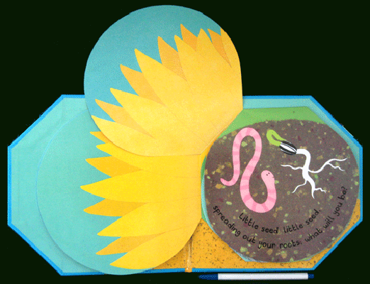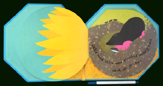 A seed is falling to the ground. What will it be? Turn the shaped pages as a mole, a worm, a snail, a bird, a bee, and other creatures watch the seed take root and sprout up through the soil. As each page fans out, revealing a bright splash of yellow, a gigantic sunflower unfolds in a brilliant display.