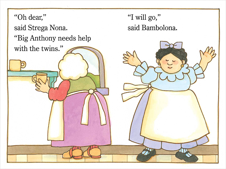 Strega Nona is babysitting twins for the day. Bambolona and Big Anthony help too. The twins, on the other hand, do not help with anything! They get into trouble everywhere they go! Luckily, Strega Nona knows what to do. |