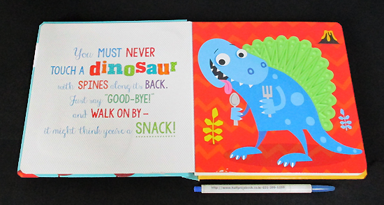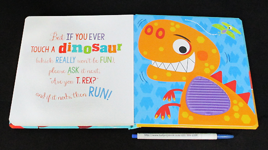 This dinosaur-themed, touch-and-feel book is perfect for young children. Little ones will love reading the funny rhyme that warns of the dangers of touching a dinosaur-and of ignoring the advice! Innovative silicone touches are featured throughout the book, with a different texture for children to discover on every spread.