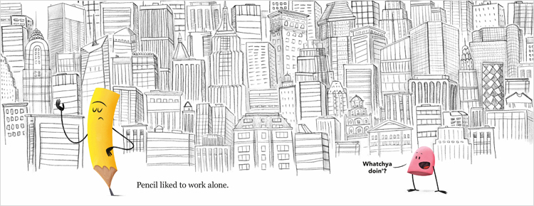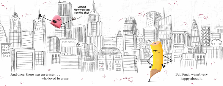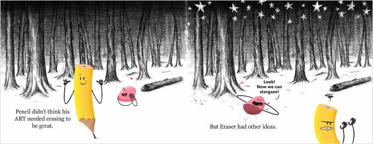 Pencil and Eraser may be inseparable now, but that was not always the case. From the beginning of the story, Pencil is obsessed with drawing and loves working alone. Enter Eraser: a happy-go-lucky companion who sees Pencil's drawings and does what Eraser does best: erase! While Eraser believes that the select removal of some of Pencil's work makes the picture better, Pencil does not agree. Their disagreements continue until one day, Pencil, like everyone does at one point or another, makes a mistake. This mistake makes Pencil realize the potential of Eraser, and it changes the course of the book. A silly, relatable story about friendship and the importance of collaboration, readers young and old alike will love this imagining of the dynamic duo that is Pencil and Eraser. Using a blend of pencil drawings and computer generated imagery, every page provides delightful stimulation both for one-on-one readers and for larger audiences. Each character has a unique font and, due to the nature of charcoal on paper, the characters are the only parts of the page in color. VERDICT This is a fun and enjoyable story to add to library and storytime shelves.