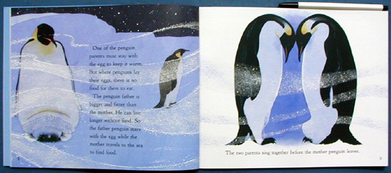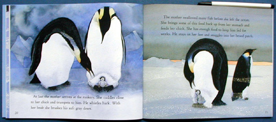 This title focuses on one emperor penguin family's survival. The parents' care of their young is central, shown by deft yet perfunctory watercolors depicting a harsh, challenging habitat. The danger of the baby's starvation is emphasized; one adult must keep it protected from the elements and the other must fish for food and return in time to feed it before it dies. Trading places, the caregivers share these duties until the chick is old enough for both adult birds to hunt for food together. A summary of a penguin's life up to the laying of an egg is followed by a section that describes the egg laying and nesting patterns of kings, Ad lies, rockhoppers, jackasses, and little blues. Brenda Guiberson's The Emperor Lays an Egg (Holt, 2001) and Martin Jenkins's The Emperor's Egg (Candlewick, 1999) will have wider appeal because of their sparkling language and vibrant art. This book's value rests on its accessibility to beginning readers. |