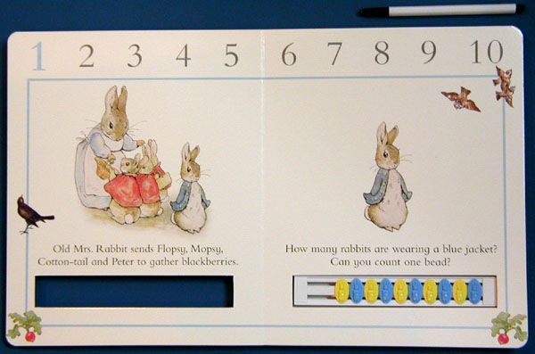 How many naughty rabbits are eating radishes in Mr. McGregor's garden? How many kittens does Mrs. Tabitha Twitchit have? Young children will have fun learning the numbers from one to ten with Peter Rabbit and his friends. On each page, there are favorite characters to count with scenes from Beatrix Potter's classic stories. The book features a die-cut design and ten colorful counting beads that show through on each page. The board book design and beads are completely child-safe and sturdy for long life and lots of learning.