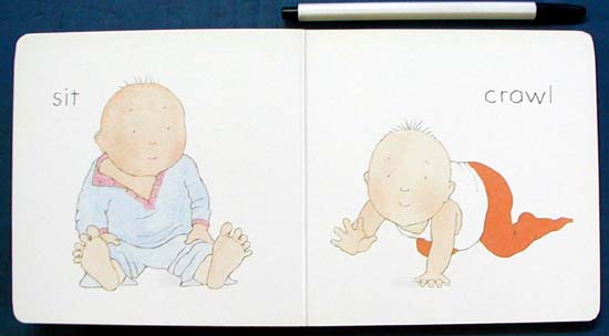 ea. vol: illus. by author. unpaged. Random. Mar. 1986. BD $2.95. PreS Oxenbury's latest board books suit toddlers who have grown beyond word recognition board books into concepts of the senses and gross motor skills. These four books look as simple, yet expressive, as her infant series of Family, Friends, etc. (all Little Simon, 1981). I Can covers motor skills like running, sliding, jumping, kicking, with one verb illustrated on each page. In the other three books, one page shows an object and names it; the facing page shows the nearly bald toddler interacting with it. Clean white backgrounds keep the focus on the baby. The sounds in I Hear are close to a young child's world: rain, grandfather's watch, a barking dog, a crying baby. I See has the young one seeing an airplane, reaching for a butterfly, gazing at a daffodil, peering at the moon. Textures are explored in I Touch . The joyful, expressive toddler pats a cat, enjoys a water tap shower, picks up an earthworm and cuddles his blanket. An excellent set. Jacqueline Elsner, South Portland Library, Maine