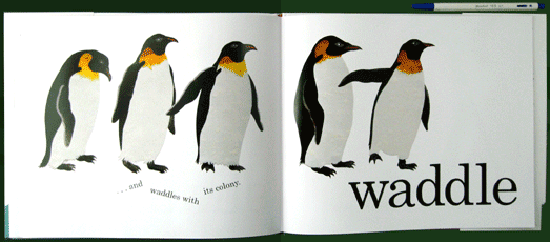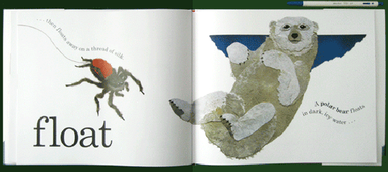 Using his deftly constructed paper collages, Jenkins portrays many creatures in nature, this time in motion. Each action verb, "swing," "dive," "slither," etc. appears in large type, along with the animal using that action. On the next double page, that animal uses another form of action, which is also employed by the next creature on the facing page; its alternate move is echoed by the next, from double page to double page. Once again the author/artists provide bits of natural history as they demonstrate a distinctive vision. Myriad papers are exploited to visualize the rabbits, spiders, road runners, etc. which move so naturally across the expanse of white pages. There are no settings, scenery, or props; just the creatures who draw our attention to their actions as we examine with visual pleasure the methods of their creation on the page. As usual the minimal text, carefully incorporated into the page design, is supplemented by extensive notes about each subject at the end of the book.