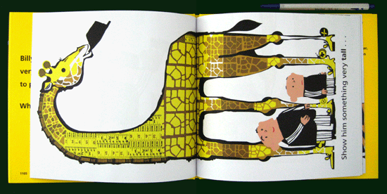 "Billy can be very difficult to please." His dad tries hard for any reaction at all, but Billy's reply is just " . . . whatever." The spare text on the double pages leaves room for depicting the "something very tall . . . " or "very small," for the world's curliest trumpet," or for bouncing Billy off "the world's bounciest castle or riding the world's smokiest train. Billy's response is always the same " . . . whatever." Finally, his dad tries to frighten him with "the world's hungriest tiger . . . " The result is rather a shock. But it does finally bring a different reply from Billy. And a rather amusing " . . . whatever" from his dad. Digitally created simplified figures on white pages with no context, not even a ground line, match the minimal text. But the visuals deliver the humor in the facial expressions and props. That "curliest trumpet" is a wonderfully intricate piece of yellow and tan plumbing with valves, meters, and a sinuous intertwining that fills the spread. The tall giraffe incorporates yardsticks in its long neck as it requires turning the book on its side for the vertical double page. Other detailed bits add to the visual fun.