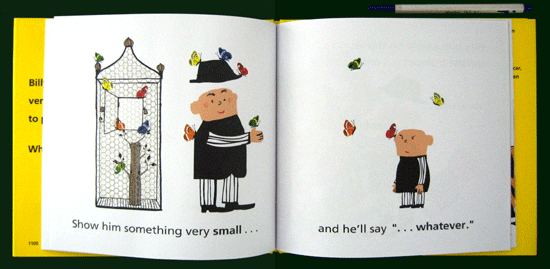 Billy can be very difficult to please. Show him something very tall or very small, and he'll say, "whatever." Let him play inside the bounciest castle, and he'll shrug and say, "whatever." Take him for a ride in the smokiest train or the speediest spaceship -- it doesn't matter. Billy's reaction is always the same. What might the surly boy say if a hungry tiger came by and his nonchalant dad gave Billy a taste of his own medicine? William Bee's quirky illustrations give an amusing new spin to a familiar scenario that will have both children and adults laughing in recognition.