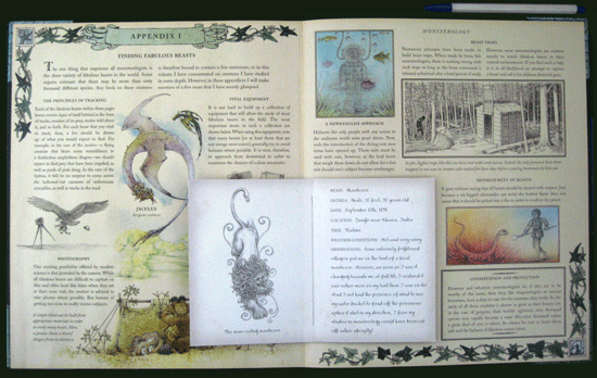 Chapter I of this book with a sparkling green cover introduces, with tongue in cheek, the facts and fancies of historical monsters, discusses their evolution and provides a full-color map of the world marked as to where monsters might be found. The book pretends to be written by a Dr. Ernest Drake, a noted monsterologist of the early 19th century. Chapters II. III, IV and V cover beasts of the earth, water and air, in that order, followed by semi-human beasts such as the cyclops, centaur, merfolk and sphinx. Appendix I and II, in high camp, explain the importance of record keeping and the necessary equipment for study such as a pencil, a spade and an assortment of nets. Helpful spells and charms are provided as well as songs, calls and whistles. Conservation and collecting are the hallmarks of an outstanding monsterologist and the names and careers of several outstanding experts are noted. The book ends with the reader facing what appears to be a carved wooden door that opens to reveal a cabinet of specimens - a prehistoric phoenix trapped in amber, a piece of yeti fur and such things. A space is available for the reader's own discovery.