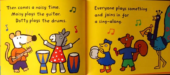 Maisy is confident and acquainted with the routines of preschool. She clearly has no separation issues. She hangs up her coat, joins in making music, listens to a story, and so on. Throughout the day, the young mouse and her friends have a good time. As always, Cousins's bright color illustrations are simple and appealing. The solid black lines around objects help them to stand out on the page, drawing children's attention. Reassuring and fun.